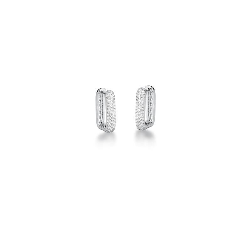 Argola retangular com três fileiras de zircônias brancas e vazado no verso com fecho de click.