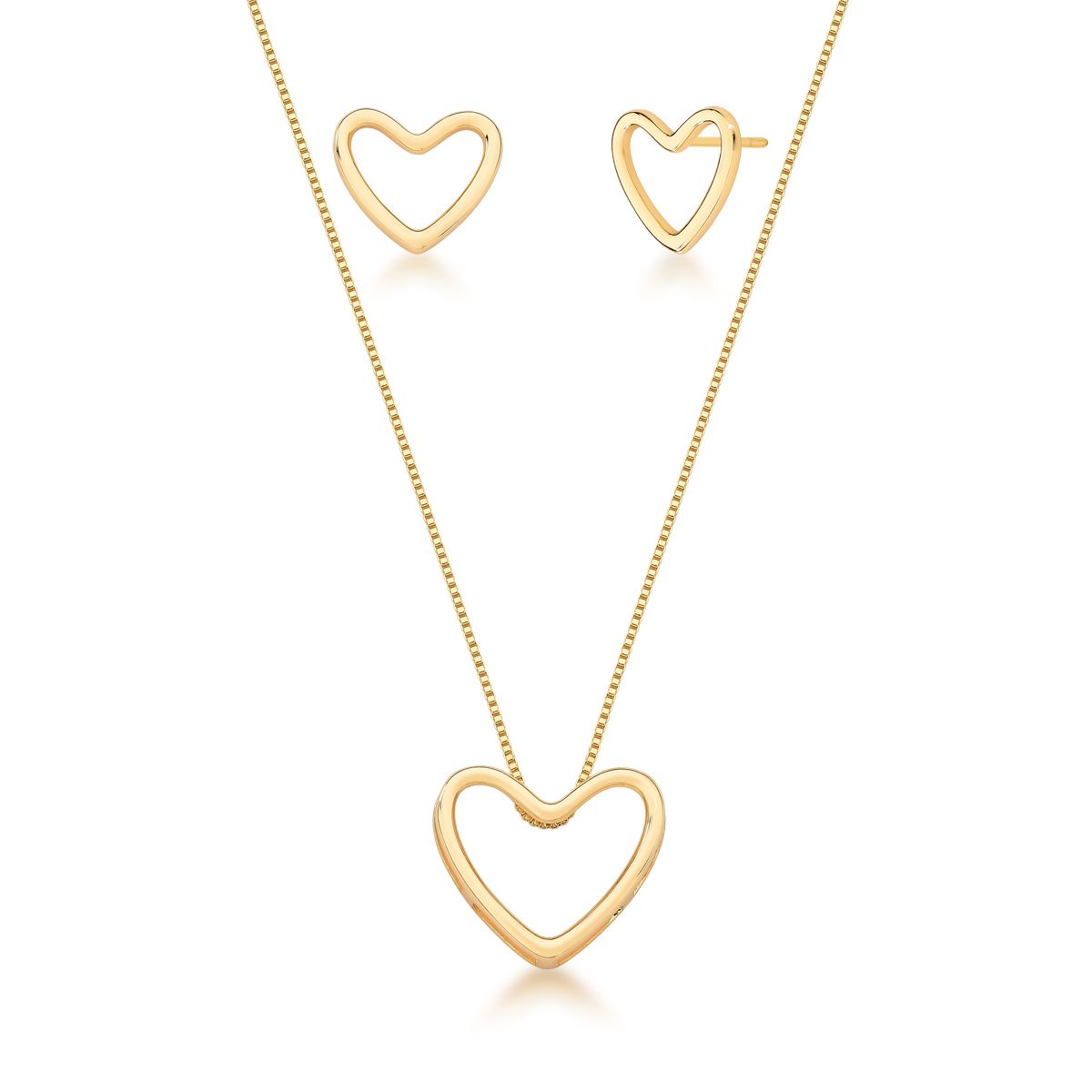 Conjunto colar em malha veneziana com pingente de coração liso e vazado e brinco de coração liso e vazado banhado a ouro.